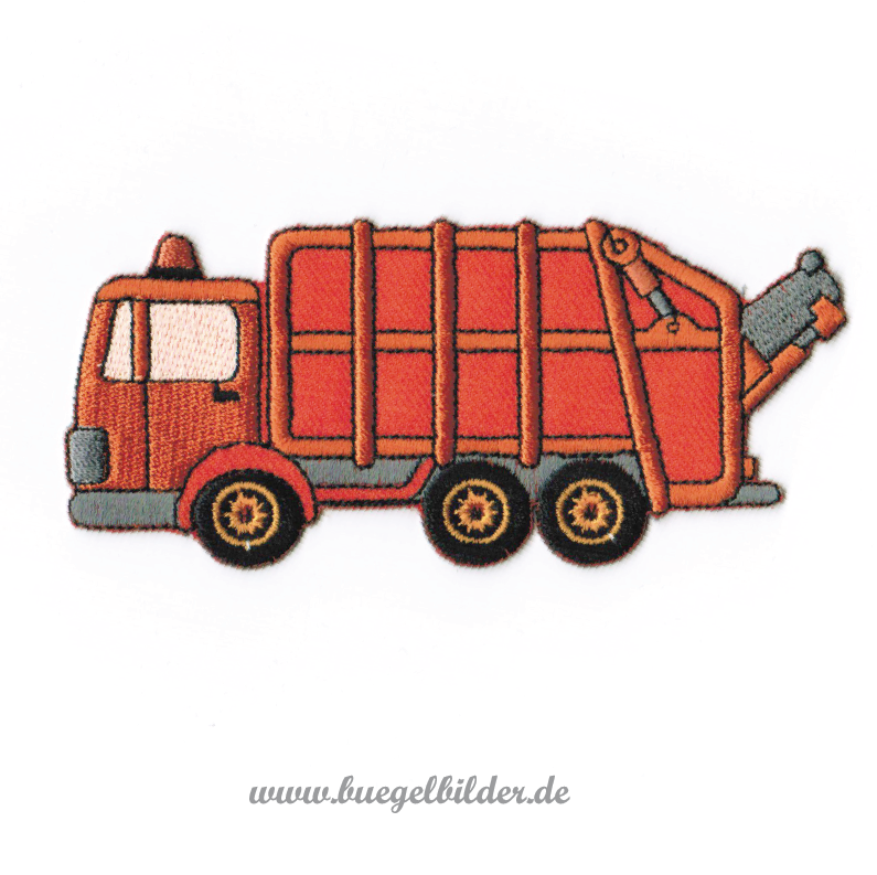 Orangefarbenes Müllauto zum Aufbügeln auf Hosen, Jacken und Pullover.