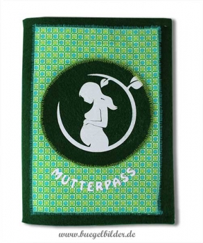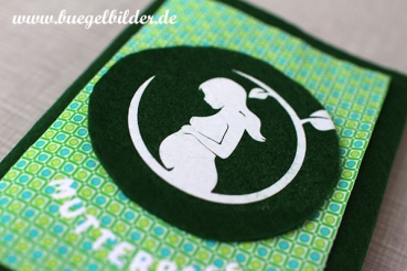 Für den treuen Begleiter durch die Schwangerschaft: diese zarte Silhouette einer werdenden Mutter ziert eine genähte Hülle für den Mutterpass.