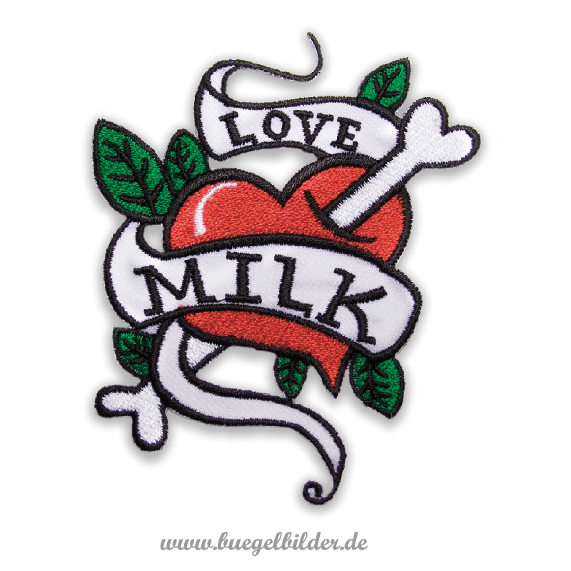Ein schönes großes Herz mit einem Band, auf dem die Liebesbotschaft "Love Milk" steht.