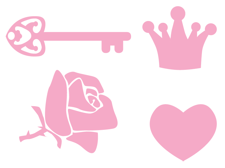 Das vierteilige Set besteht aus einer Krone, einer Rose, einem Schlüssel und einem kleinen Herz.