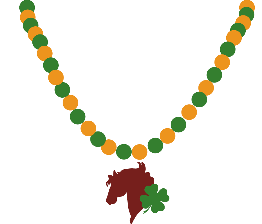 Der Bogen der Kette ist ca. 20 cm breit und circa 15 cm hoch. Das Pferd samt Kleeblatt ist ca. 4 cm hoch.