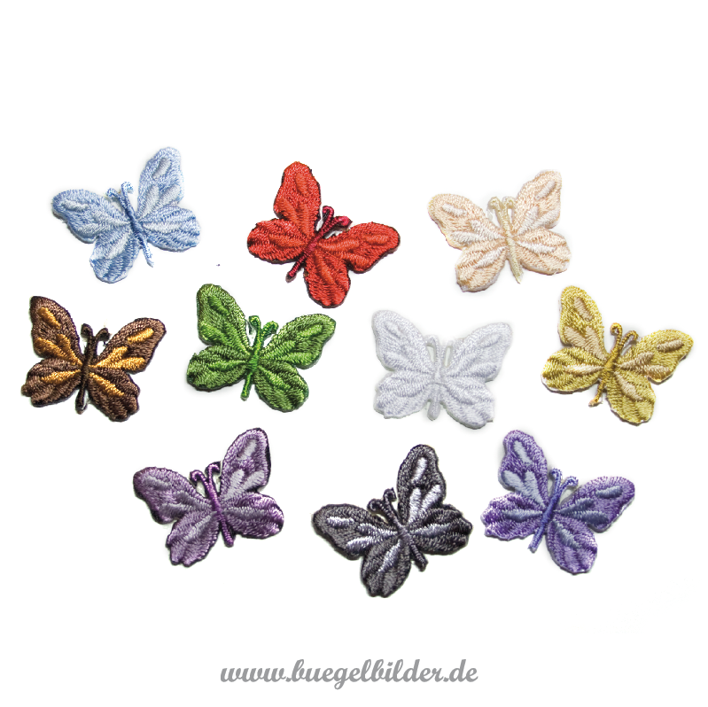 10 kleine gestickte Schmetterlinge zum Aufbügeln in zehn verschiedenen Farben im Set: