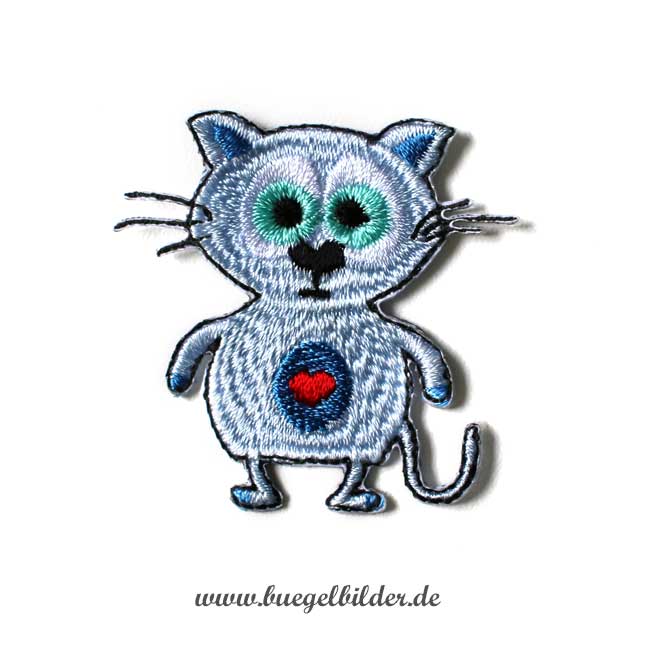 Die kleine Katze in sauber gestickt: Das Fell ist hellgrau, die Ohren, Tatzen und Bäuchlein in Blau, die Augen in Katzengrün und das kleine Herz auf dem Bauch in einem leuchtenden Rot. Die Schnurrhaare und der Körper sind mit einer schwarzen Kontur eingefasst.