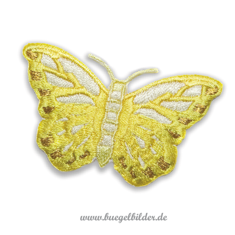 Der Schmetterling zum Aufbügeln ist in verschiedenen Gelbtönen mit goldenen Akzenten gestickt.