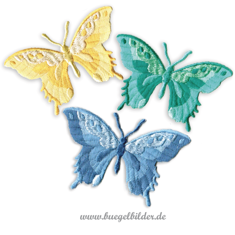 Jeder Schmetterling zum Aufbügeln ist in 3 verschiedene Farbnuancen (Blautöne, Gelbtöne, Minttöne) gestickt.