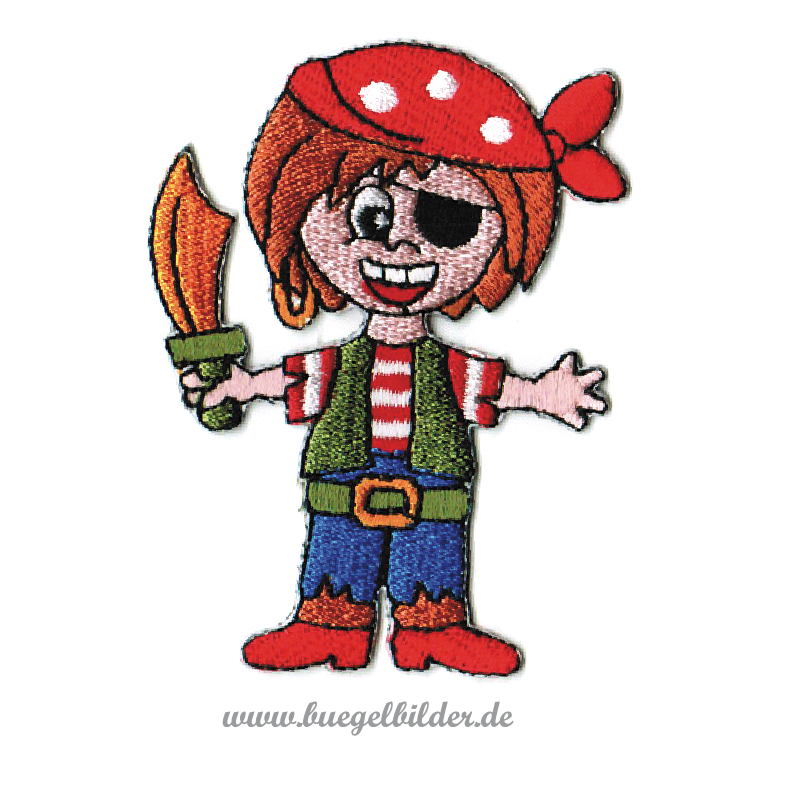 Der kleine Pirat zum Aufbügeln ist mit vielen bunten Farben aufwendig gestickt: Rot, Grün, Blau, Orange, Braun, Weiß und Beige. Die Konturen sind schwarz umrandet.