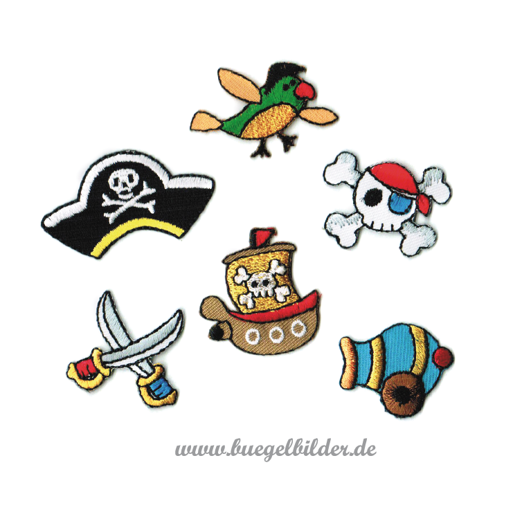 Ein grün-gelber Papagei mit Kapitänshut, ein Piratenhut mit Totenkopf-Stickerei, eine blau-gelbe Kanone, ein kleines PIratenschiff mit Totenkopf-Flagge und Kanone, zwei sich kreuzende Schwerter mit bunten Griffen und ein Totenkopf mit Augenklappe und rotem Kopftuch.