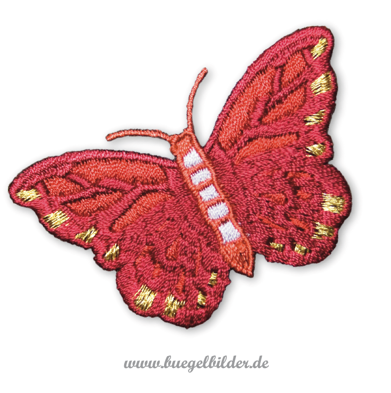 Der Schmetterling zum Aufbügeln ist in 3 verschiedene Rottönen mit goldenen Akzenten gestickt.