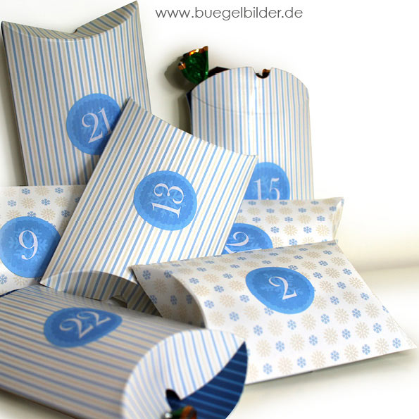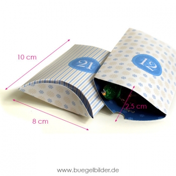 In die Kissenschachteln, auch Pillowboxen genannt, passen viele zauberhafte Geschenke, die jeden Tag vor Weihnachten versüßen können: Schokolade, Bonbons, Gummibären, ein eingerollter Gutschein, Schmuck, ein Seidentuch und und und.