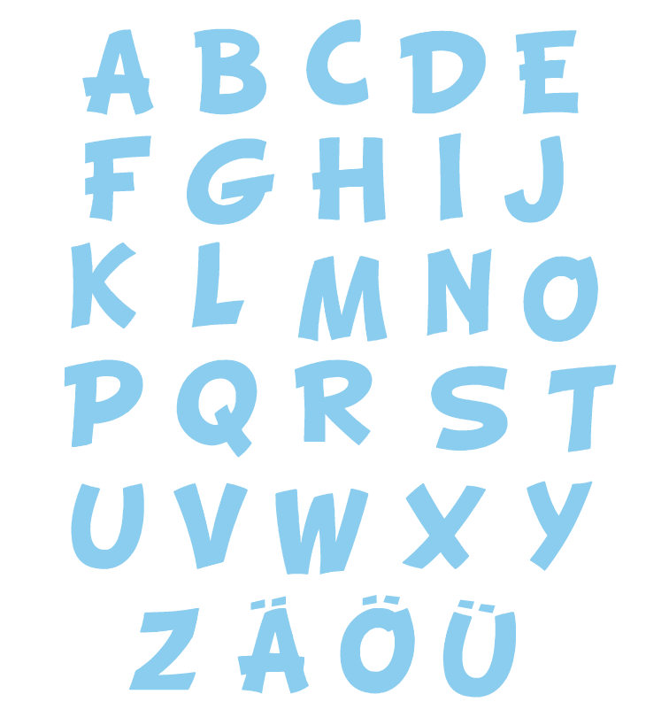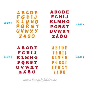 Das Bügelmotiv mit allen Buchstaben können Sie im Format DIN A5 (ca. 20 cm hoch und 16 cm breit) oder DIN A4 (ca. 30 cm hoch und 21 cm breit) bestellen.