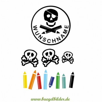 - großes Hauptmotiv (16 cm im Durchmesser) mit Piratenkopf und individuellem Namen des Schulkindes. Den Wunschnamen geben Sie bitte unter dieser Artikelbeschreibung ein.