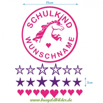 - großes Hauptmotiv (16 cm im Durchmesser) mit beliebten Oskar-Designs, wie z. B. Pirat, Fußball, Einhorn, Pferd; mit Schriftzug "Schulkind" und individuellem Namen des Schulkindes. Den Wunschnamen geben Sie bitte unter dieser Artikelbeschreibung ein.