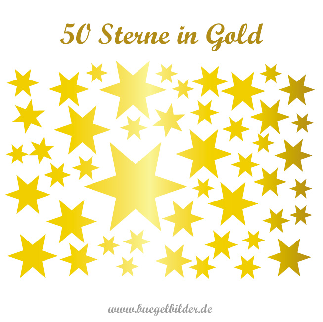 Die Sterne sind auf einem DIN A5-Bogen angeordnet. Jeder goldfarbene Stern hat für sich zwischen 3,5 cm und 1 cm im Durchmesser. Sie schneiden die Sterne aus und drapieren Sie nach Belieben auf Ihrem Textil.